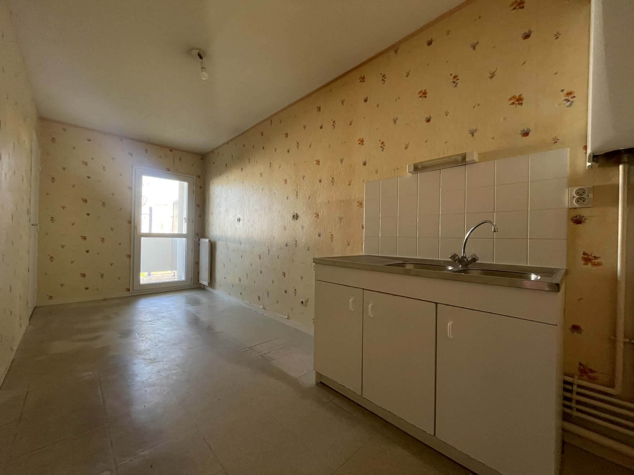 L’entrée s’ouvre sur un grand séjour, suivi de la cuisine. Il est possible d’ouvrir la cuisine sur le séjour (mur non porteur) afin de créer un vaste espace de vie. Le séjour, ainsi que la cuisine à aménager et équiper, donnent directement accès au balcon.